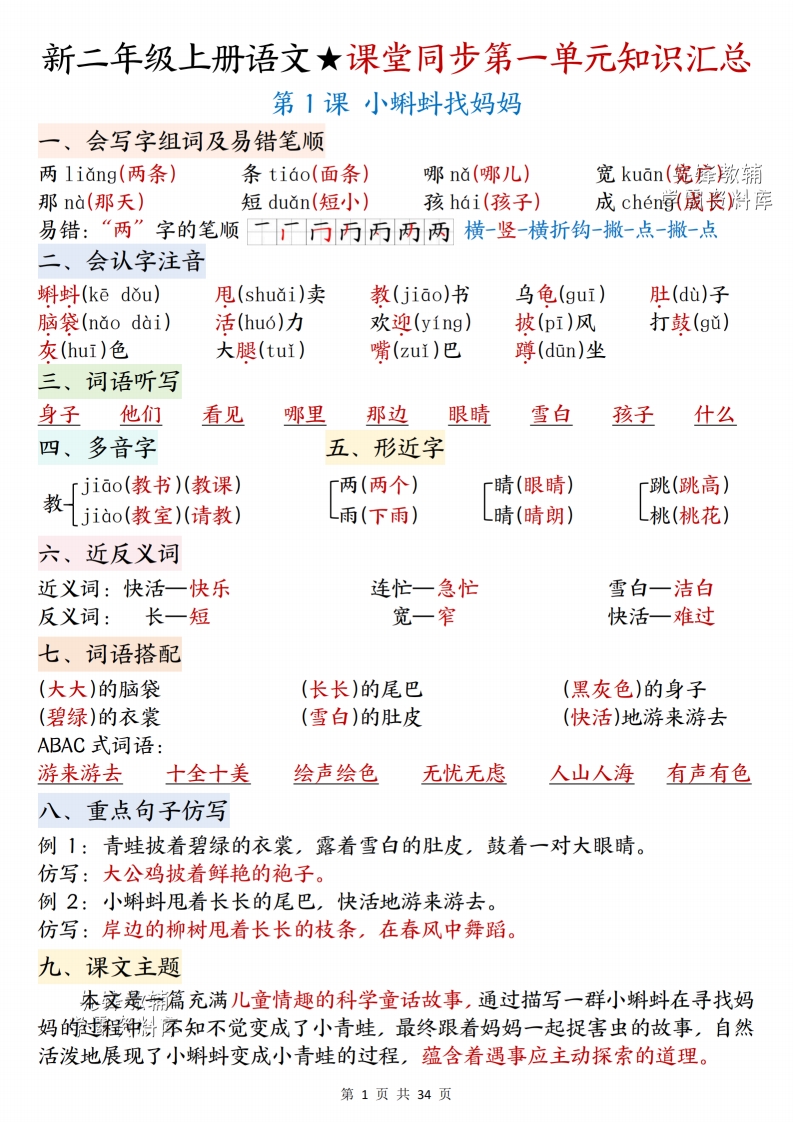 首页二年级二年级上语文二年级(上)语文课堂同步1-4单元知识汇总